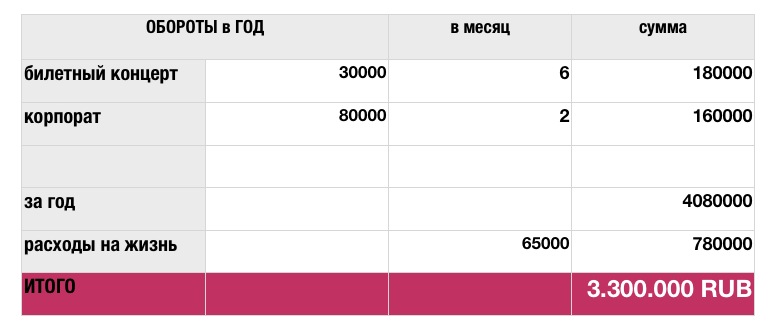 Я посчитал, что при гонораре группы за концерт в 50 000 рублей и 6 концертах в месяц, с 2мя корпоративами в месяц с гонораром в 80 000 рублей потраченную на производство альбома суму можно набрать года за полтора активной деятельности.