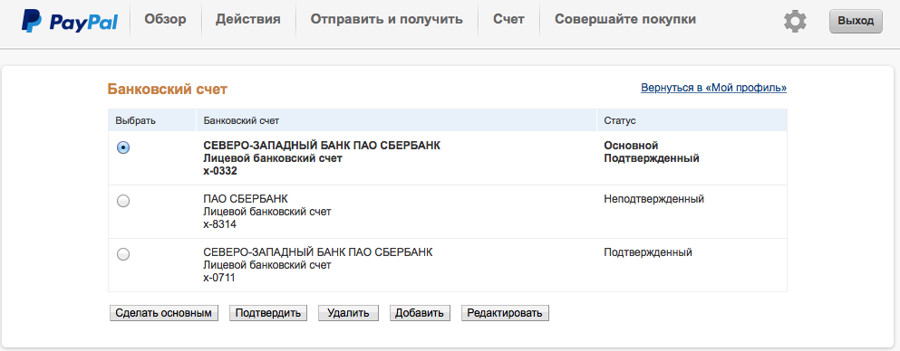 И оно добавит в систему этот счет. То есть ПэйПал уведомит о переводе двух малых сумм на этот счет. И нужно будет зайти в систему снова и внести в предложенные места эти суммы. Тогда счет будет считаться подтвержденным и можно будет выводить на него рублевые средства.
