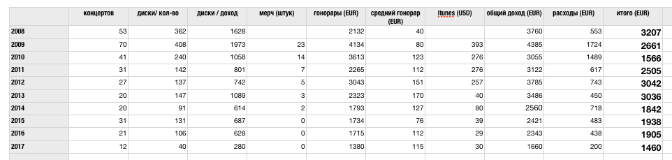 Привожу сводную таблицу за 10 лет учета концертной и музыкальной деятельности.