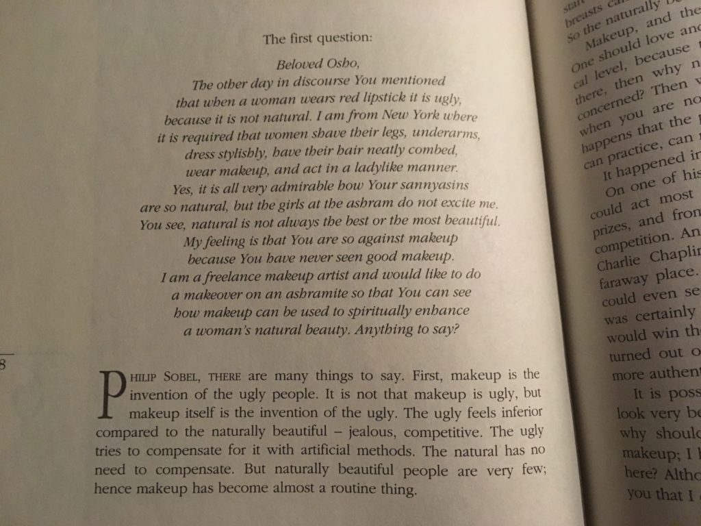 Пару дней назад во время дискурса ты отметил, что помада на губах женщины это уродливо, так как это не натурально. Я из Нью-Йорка, где от женщины требуется брить ноги, подмышки, одеваться стильно, быть аккуратно причесанной, носить макияж и вести себя подобно леди. Да, здорово видеть что твои саньясины настолько натуральны, но девушки ашрама меня не возбуждают. Понимаешь, природное не всегда самое лучшее или наиболее красивое. Мое ощущение таково, что ты выступаешь против макияжа по причине того, что никогда не видел хороший макияж. Я фрилэнс-визажист и хотел бы предложить создание образа для любой жительницы ашрама, чтобы ты мог увидеть как макияж может быть использовать для того, чтобы духовно усилить природную красоту женщины. Есть что сказать?Филип Зобель,